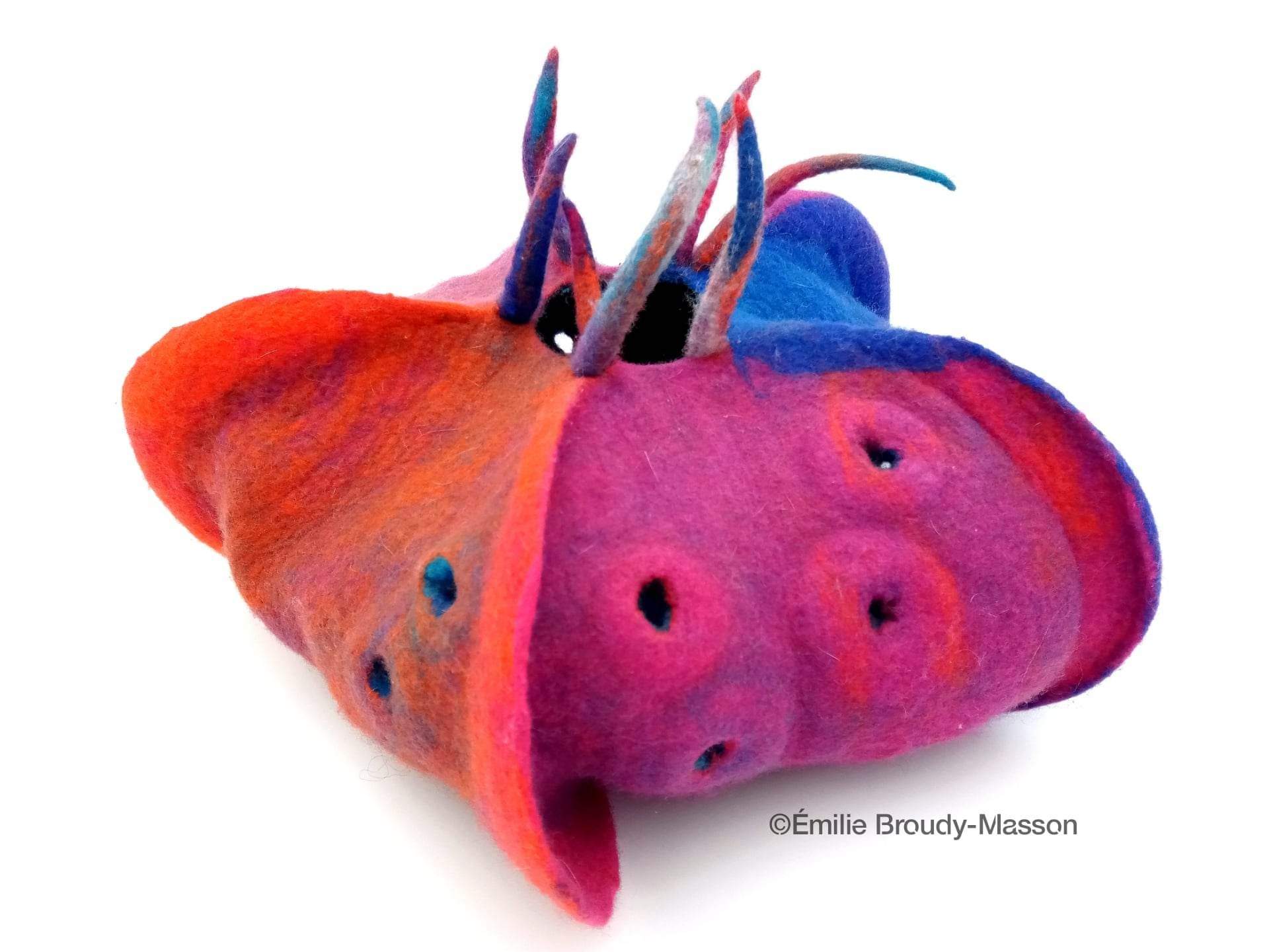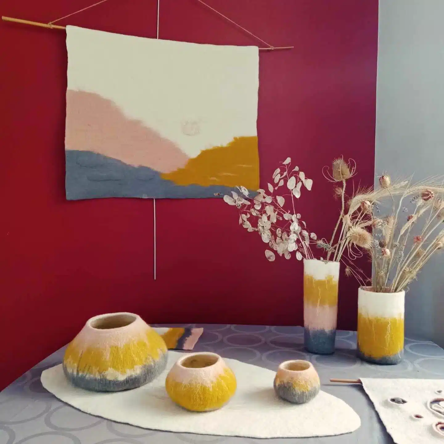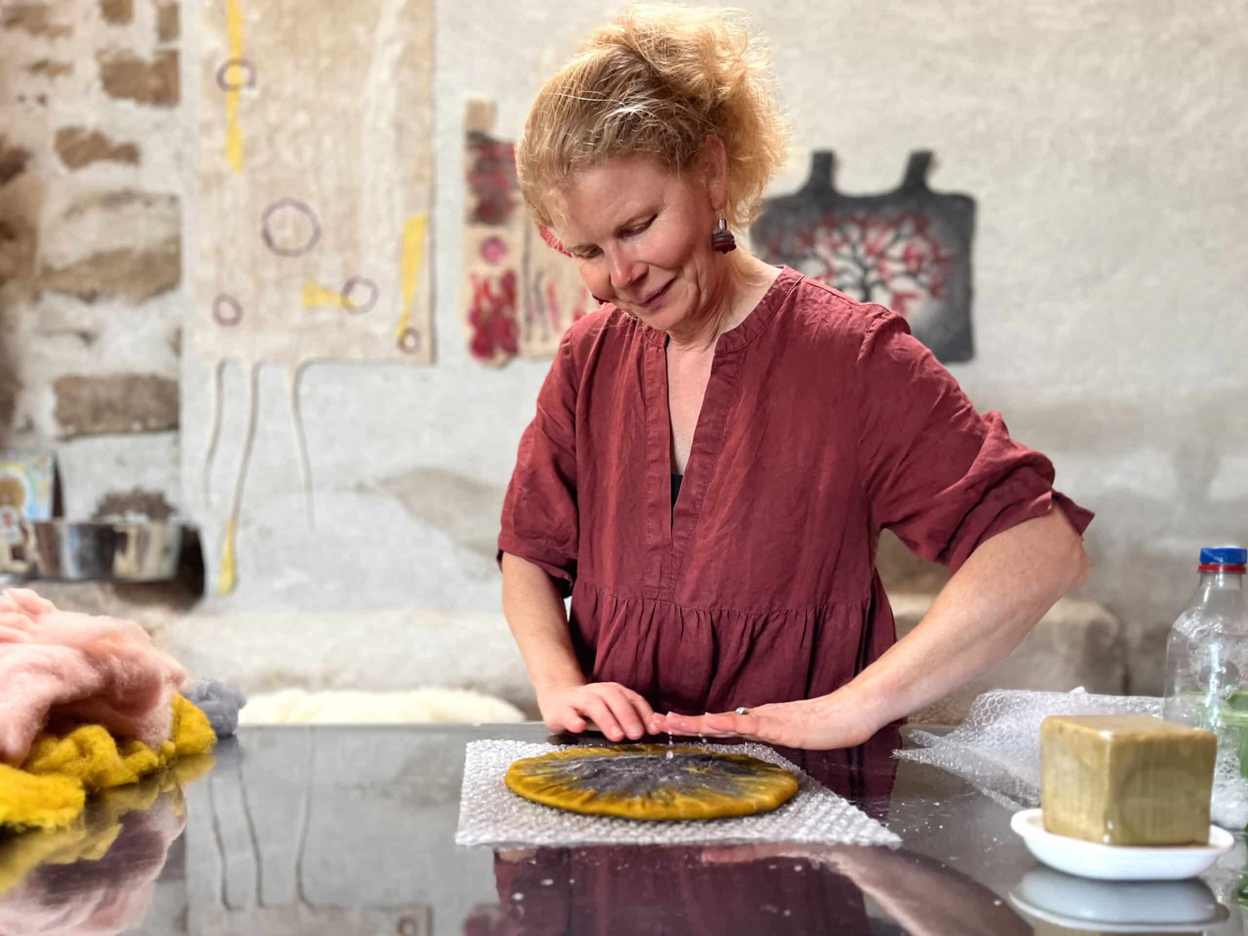 Feutrière depuis plus de 10 ans, je suis installée en Creuse, c'est là dans mon atelier que je feutre la laine à l'eau chaude savonneuse. Technique ancienne qui permet de créer un textile unique, à plat ou en volume, fin ou épais, souple ou rigide.... La technique permet de créer des effets de matière, de jouer sur les couleurs, les formes....