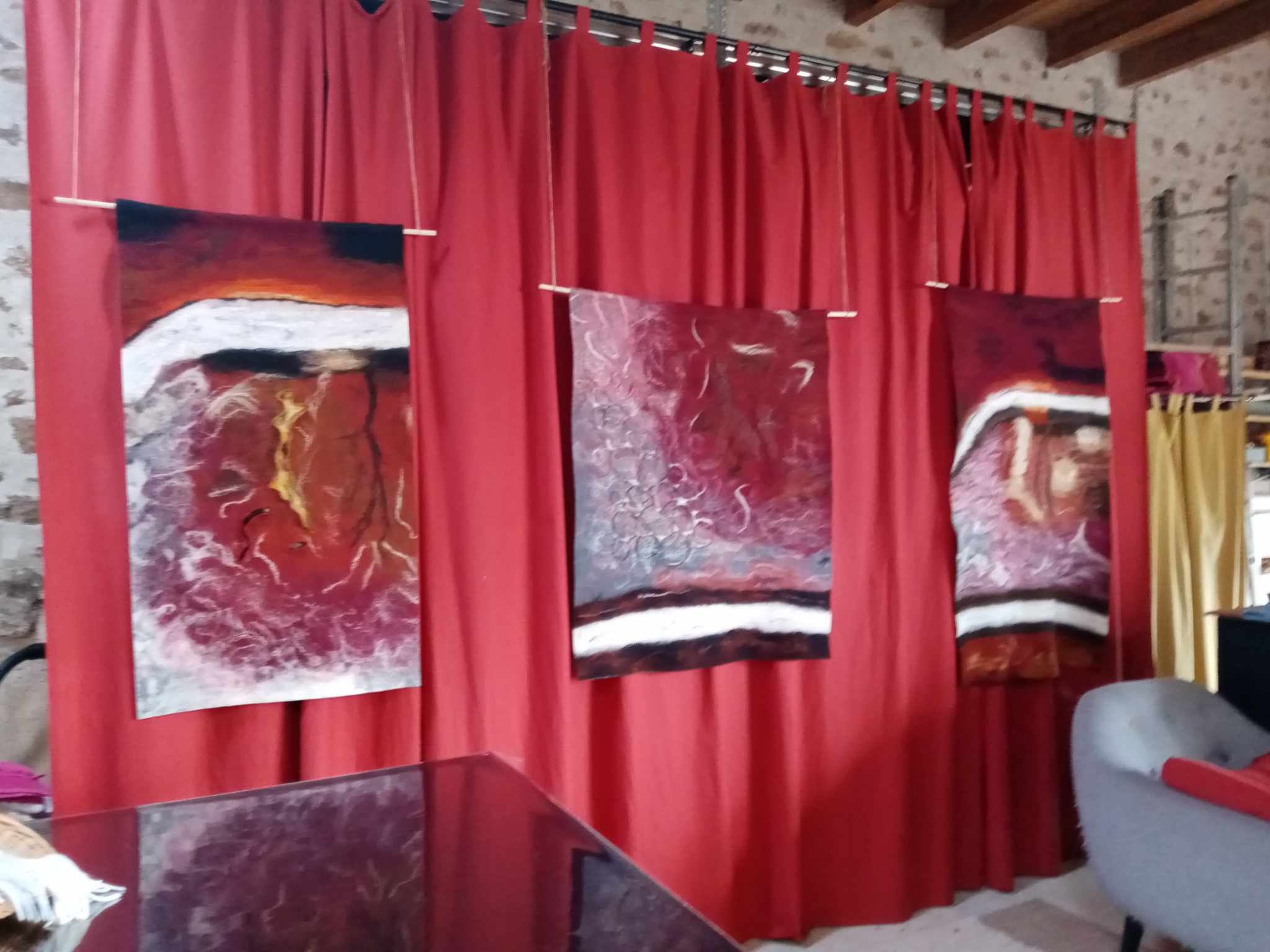 Je feutre aussi des objets de décoration intérieure ( vase, vide-poches, cocon....) et des grands tableaux: actuellement je travaille d'après des photos aériennes de lacs salés ou de marais salants que je transpose en feutre.