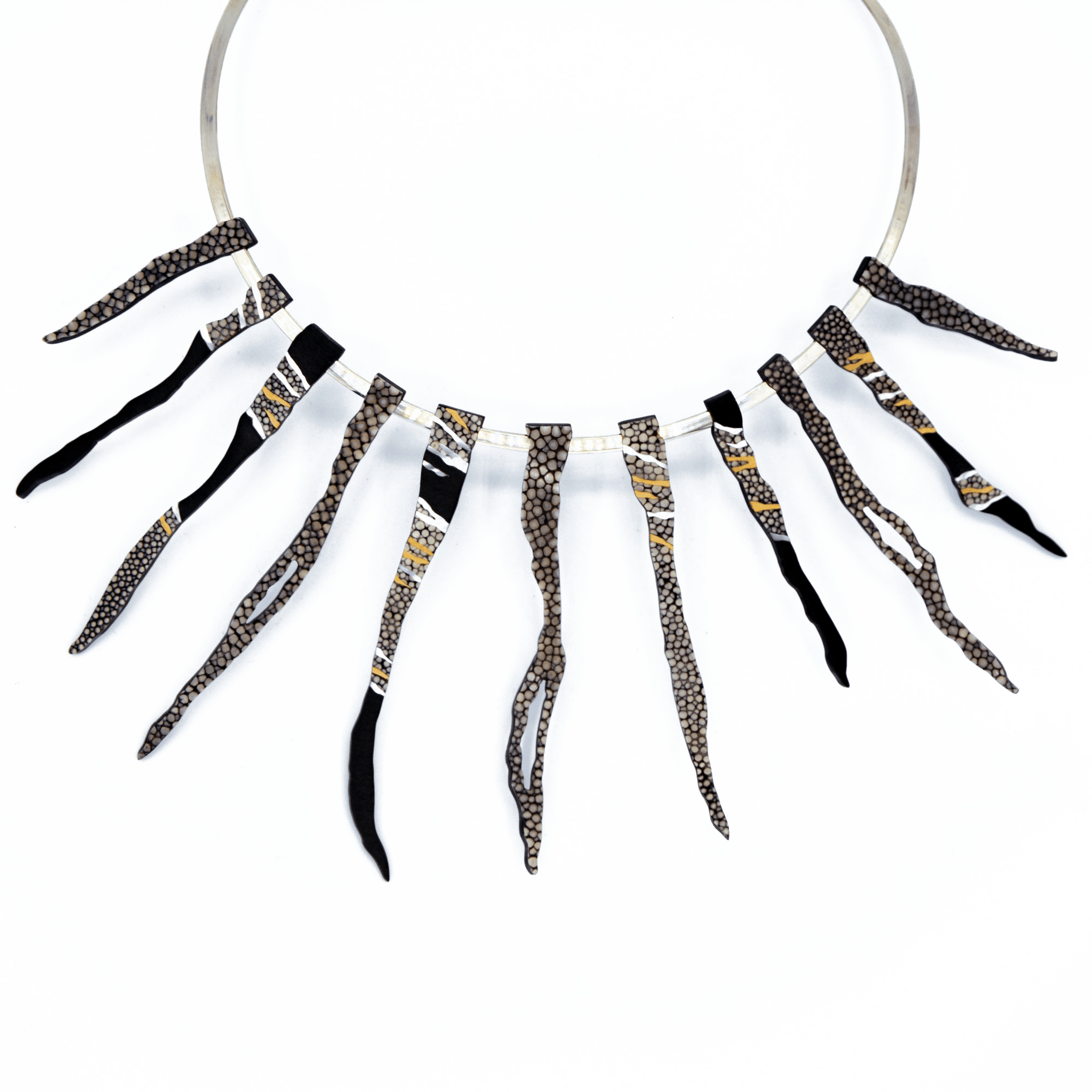 Diplômée des métiers d'art de l'école Boulle, je dévoile une partie de mon univers à travers la création de pièces uniques : tableaux, sculptures, bijoux en marqueterie multi matières mêlant bois, nacre, métal et galuchat.