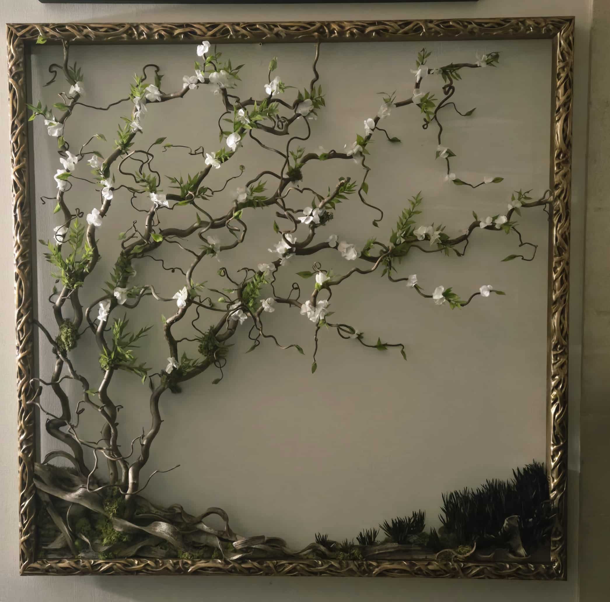 Cadre bois doré 100 x 100 dont le décor est réalisé avec des branches de saule tortueux, des lianes surfing, des pétales d'hortensia pour représenter les fleurs, des feuilles de ruscus , du pin maritime