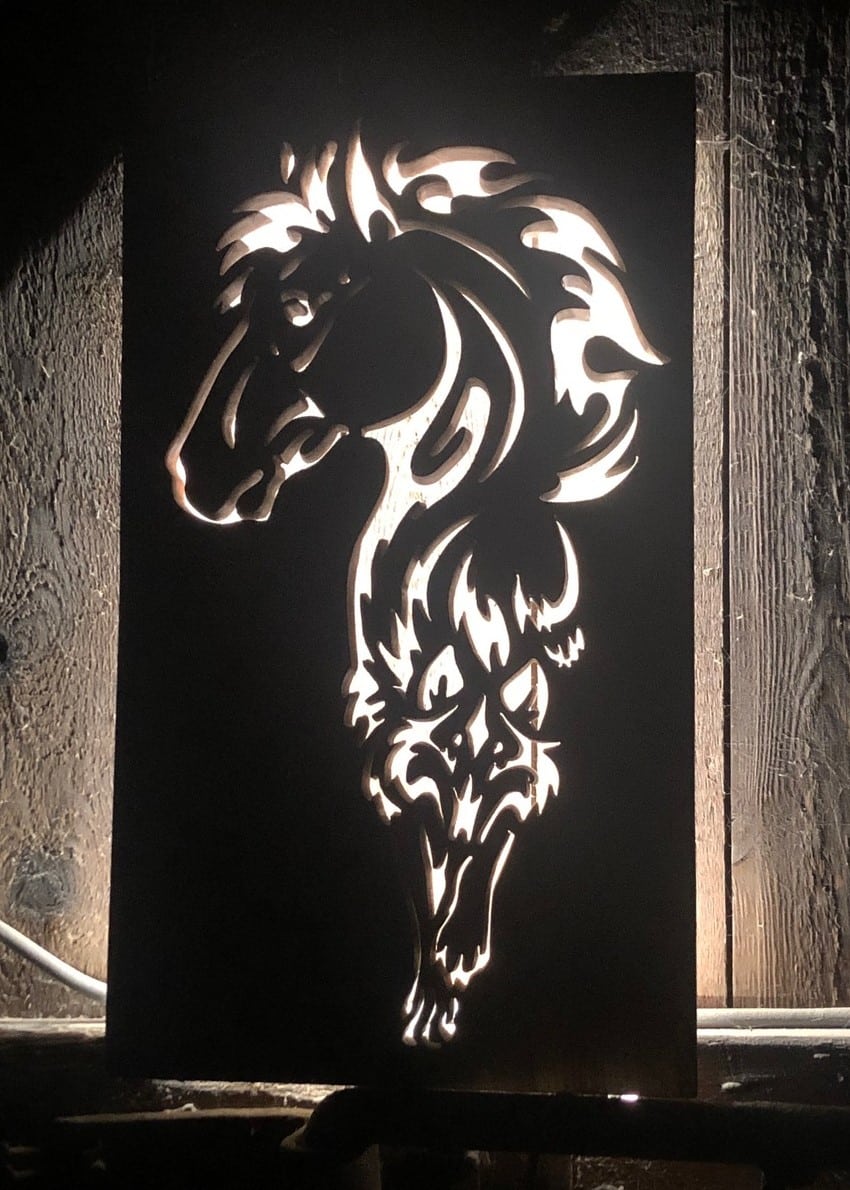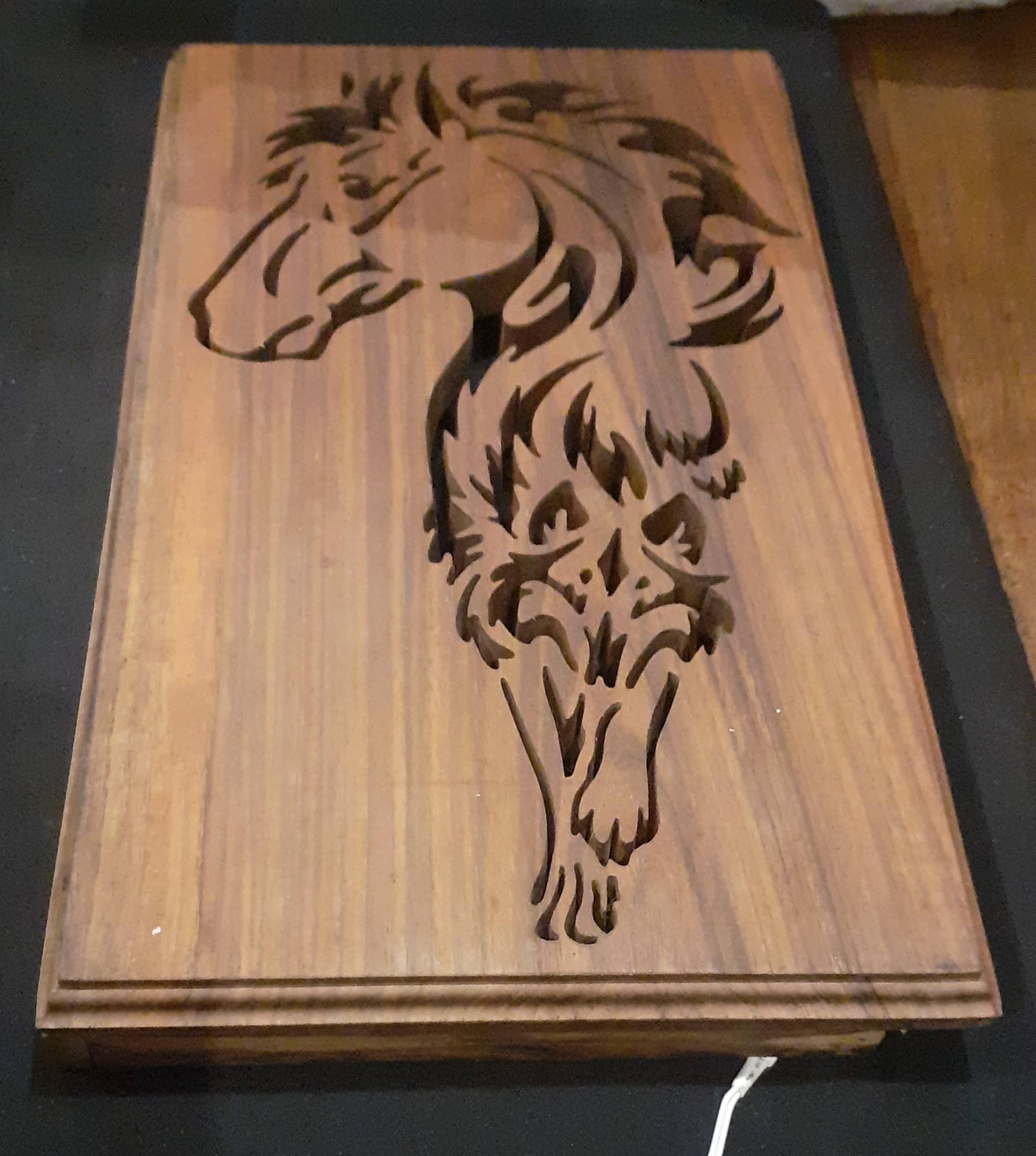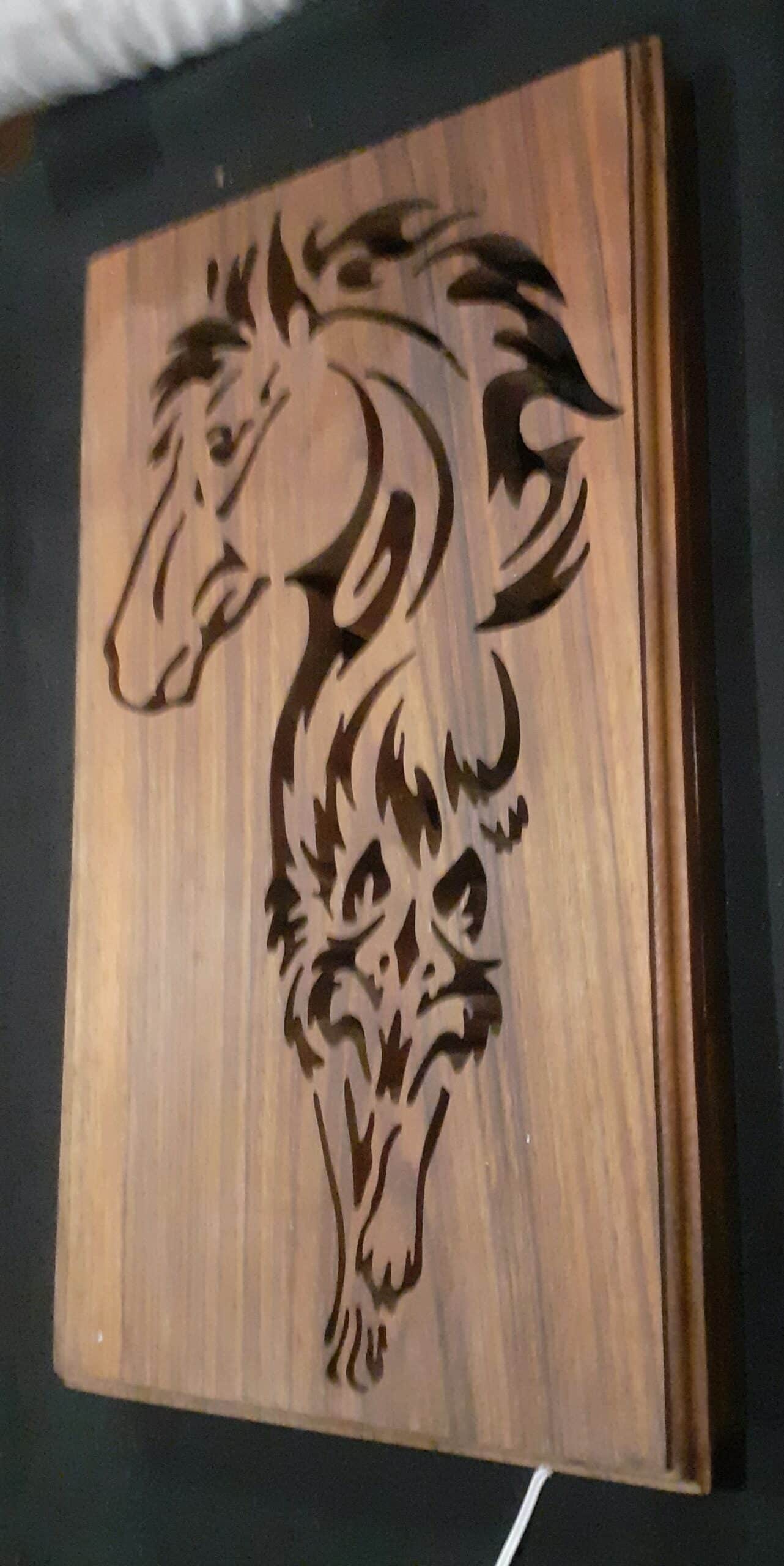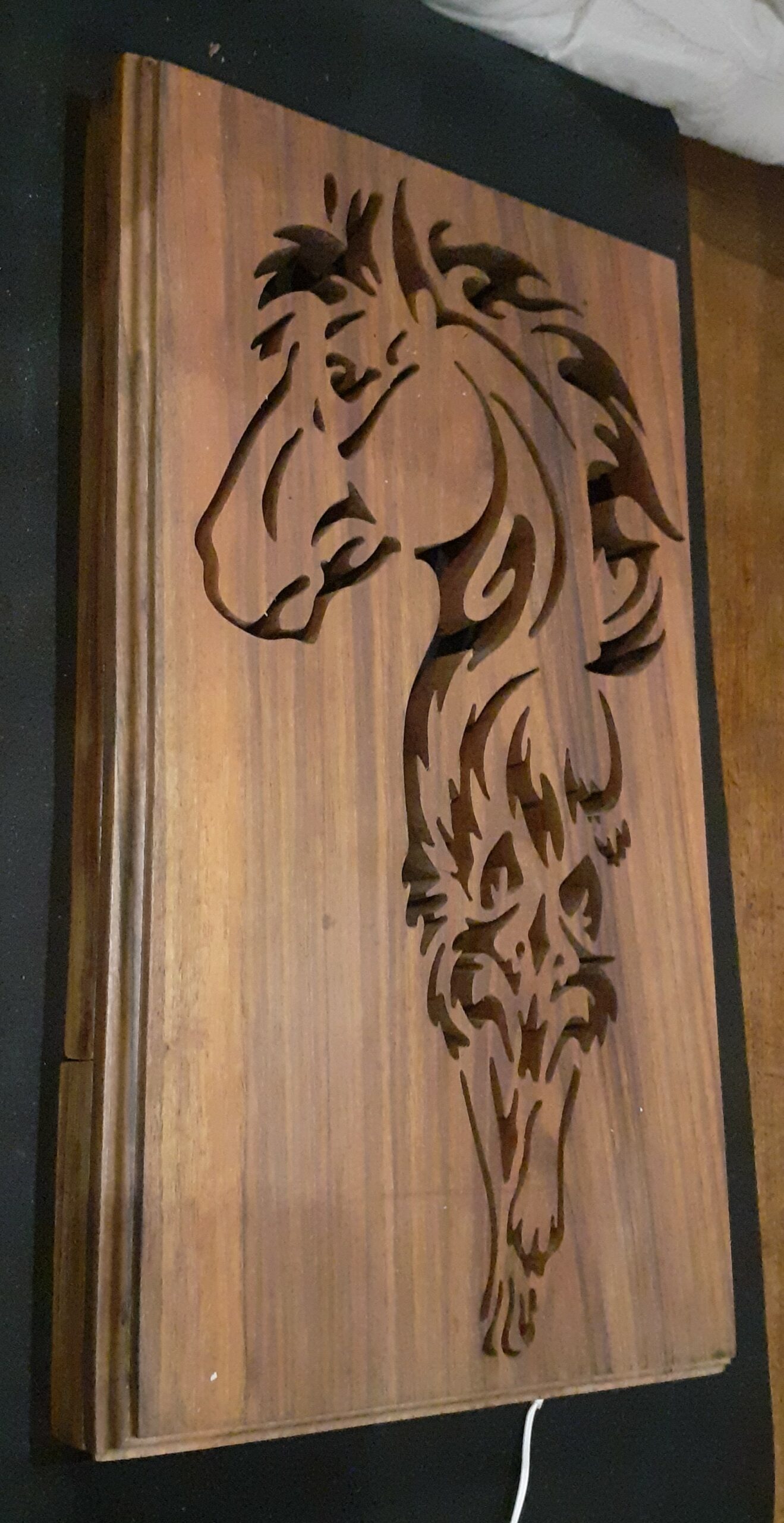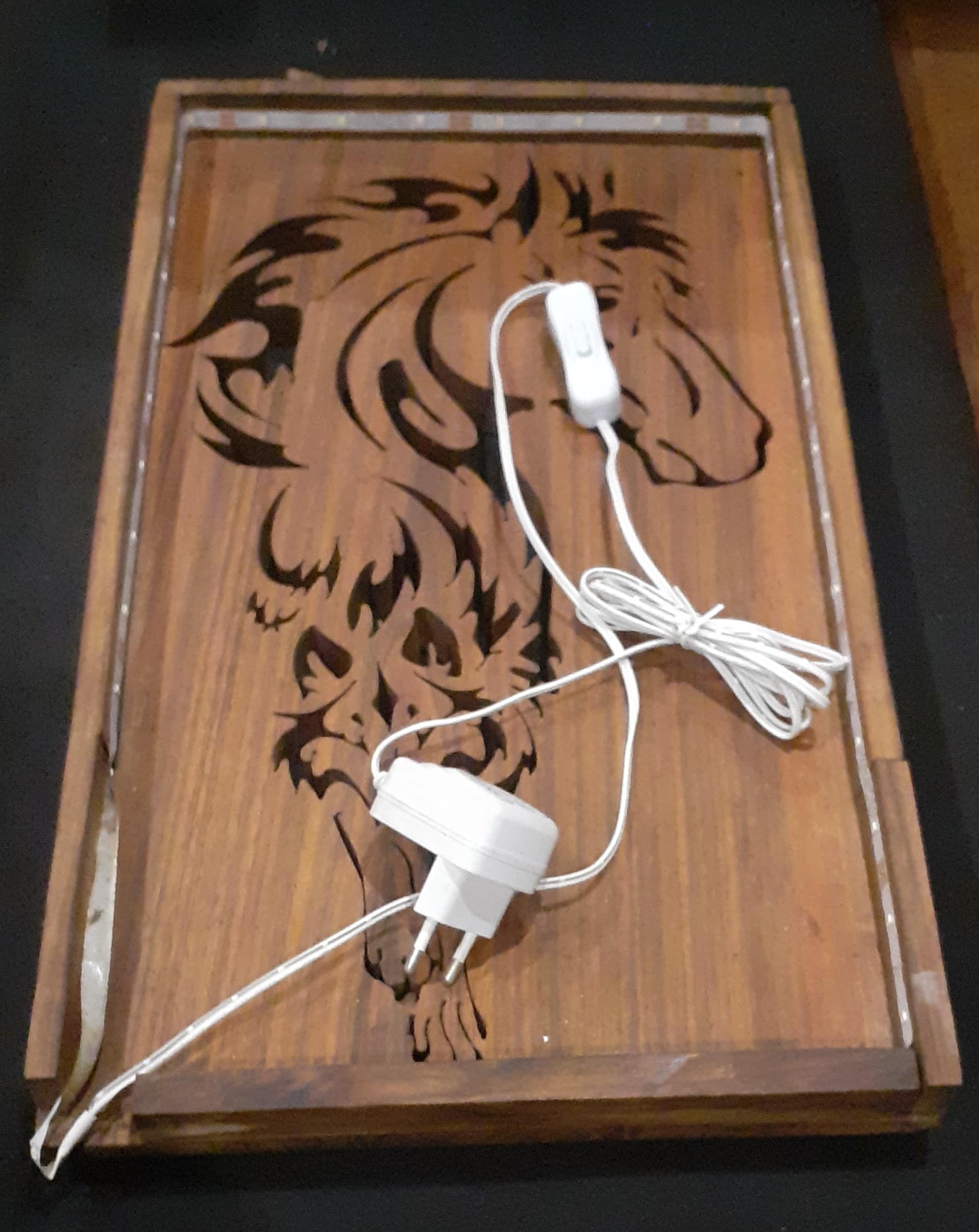 Le coffrage au dos, également réalisé dans cette essence, permet d'avoir collé une bande LED permettant, comme une des photos le montre, de laisser la lumière de celle-ci passer au travers de la fameuse dentelle. A noter qu'il vous sera possible de changer la bande pour une autre de couleur différente que la lumière blanche actuelle....