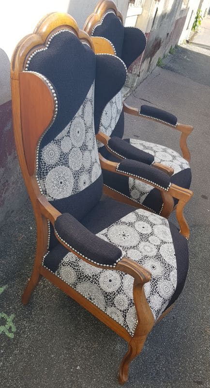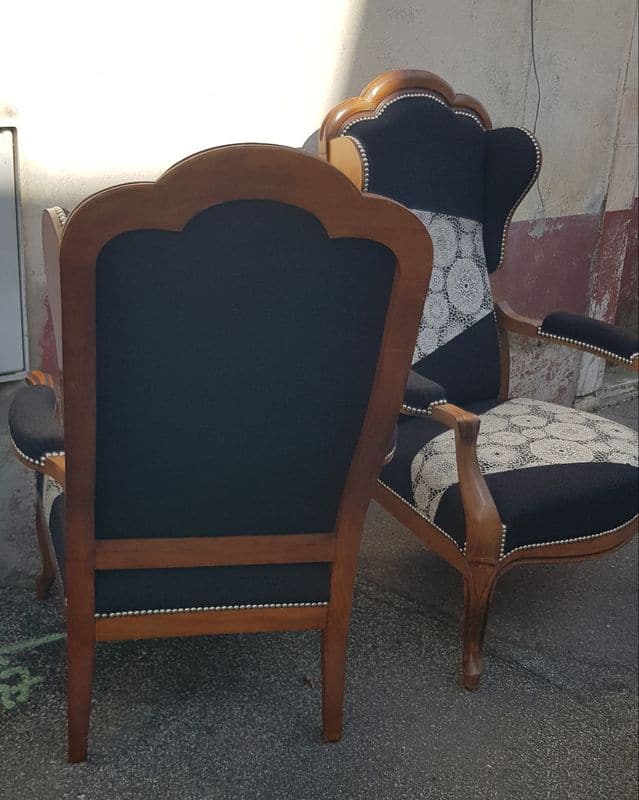 Paire de fauteuils Voltaire restaurés en travail contemporain, mousse Bultex avec pose de semelles et profilés sur sangles élastiques.
