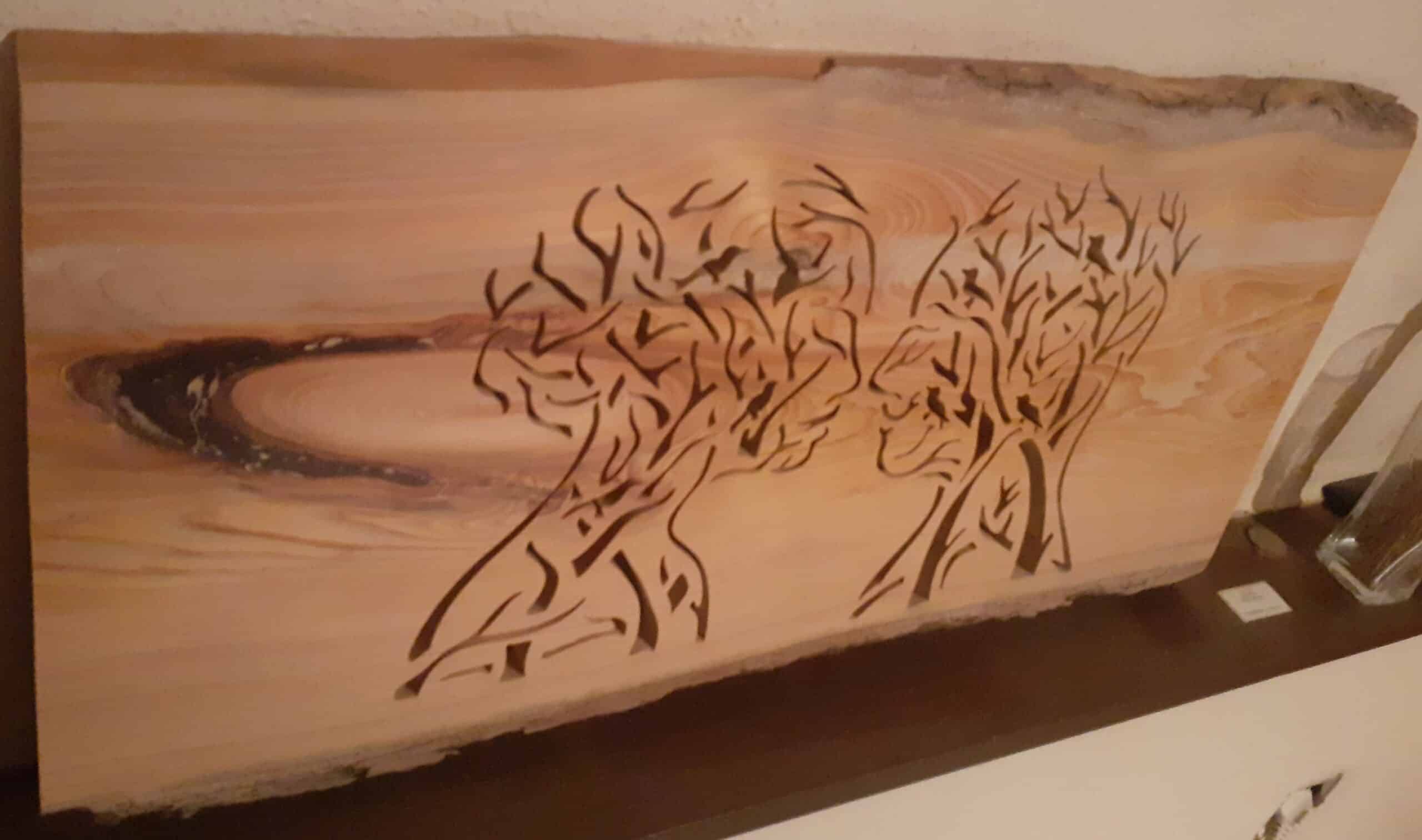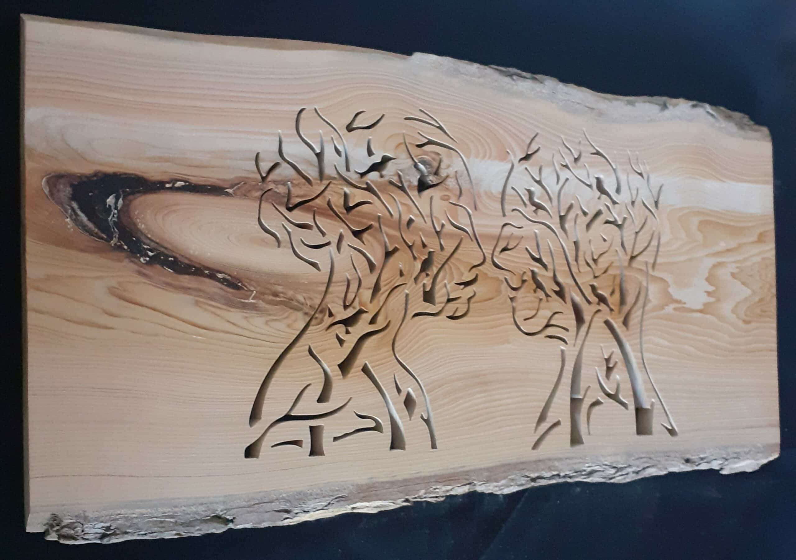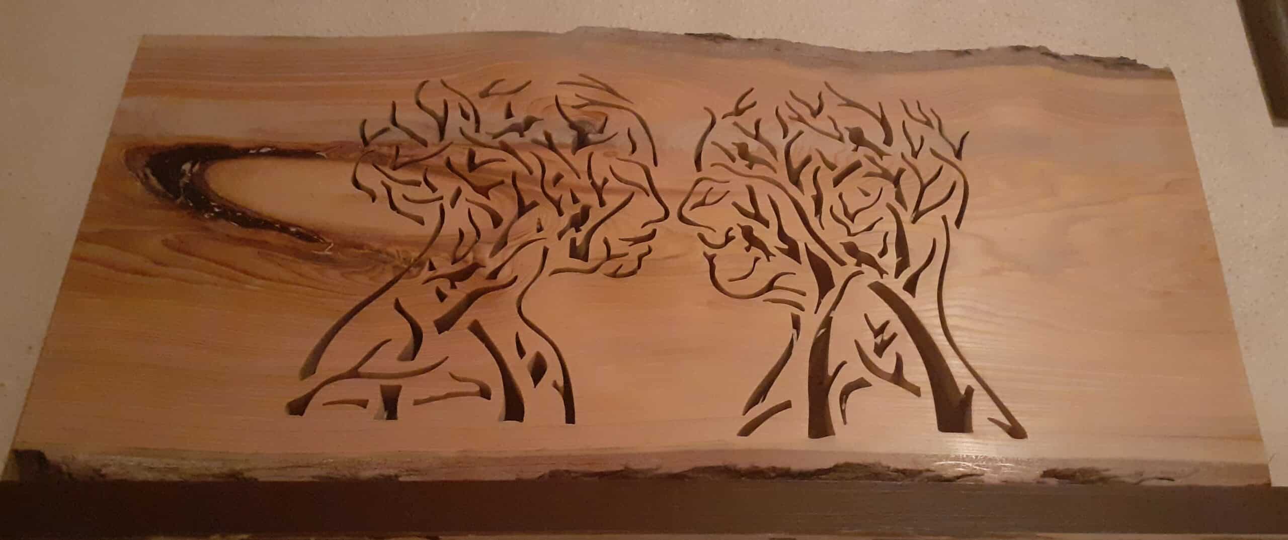 Tableau mural réalisé dans du bois de Cèdre ; travaillé selon la technique dite dentelle sur bois à l'aide d'une scie à chantourner électrique pour la phase découpe.