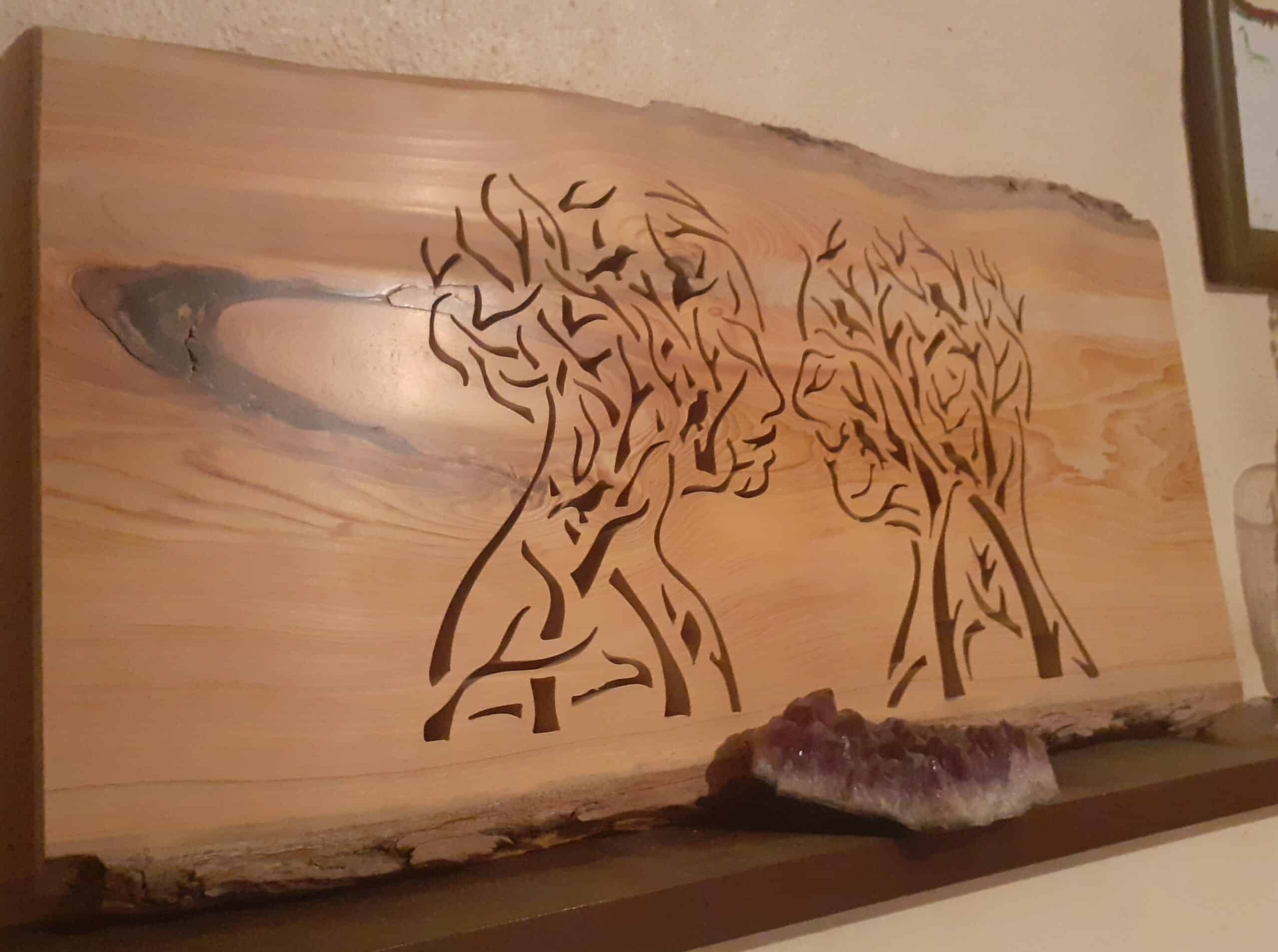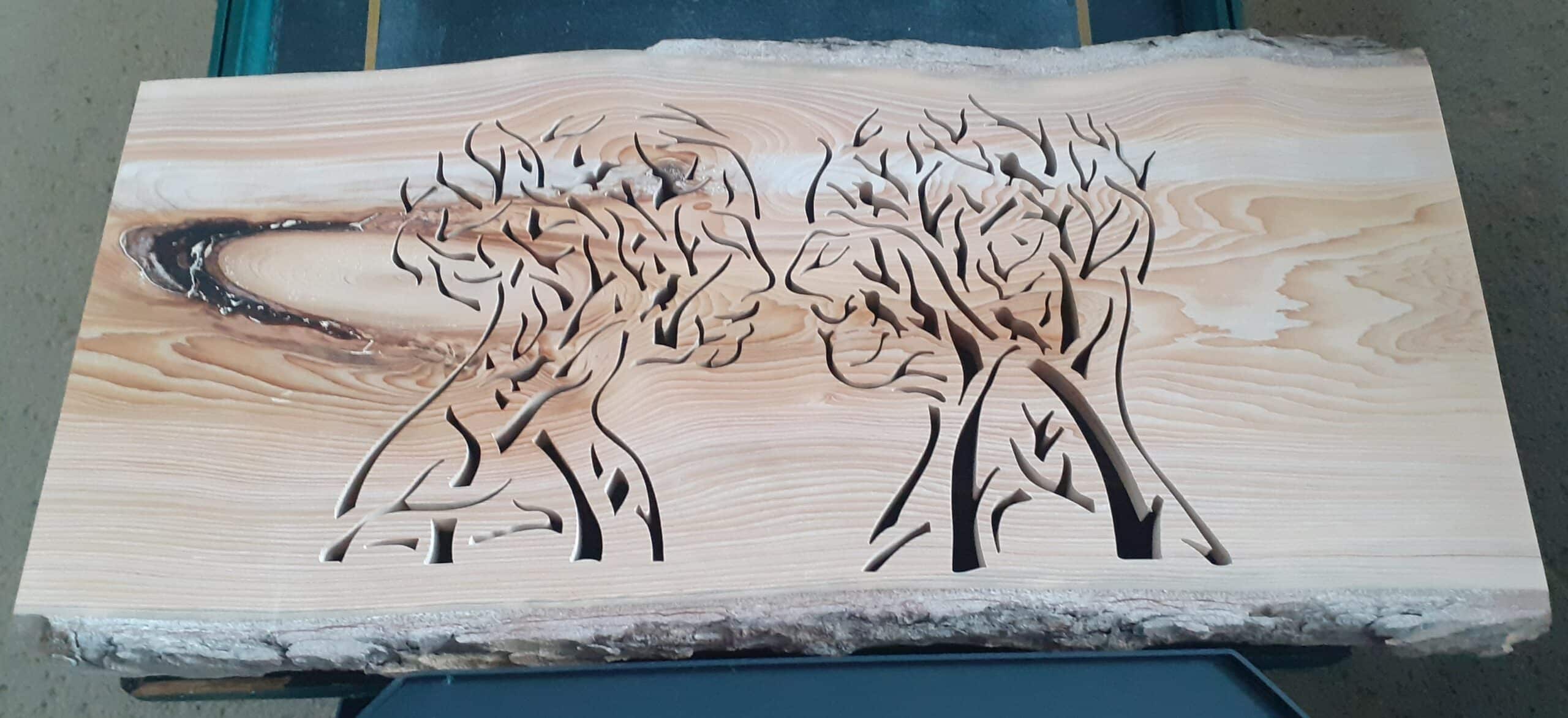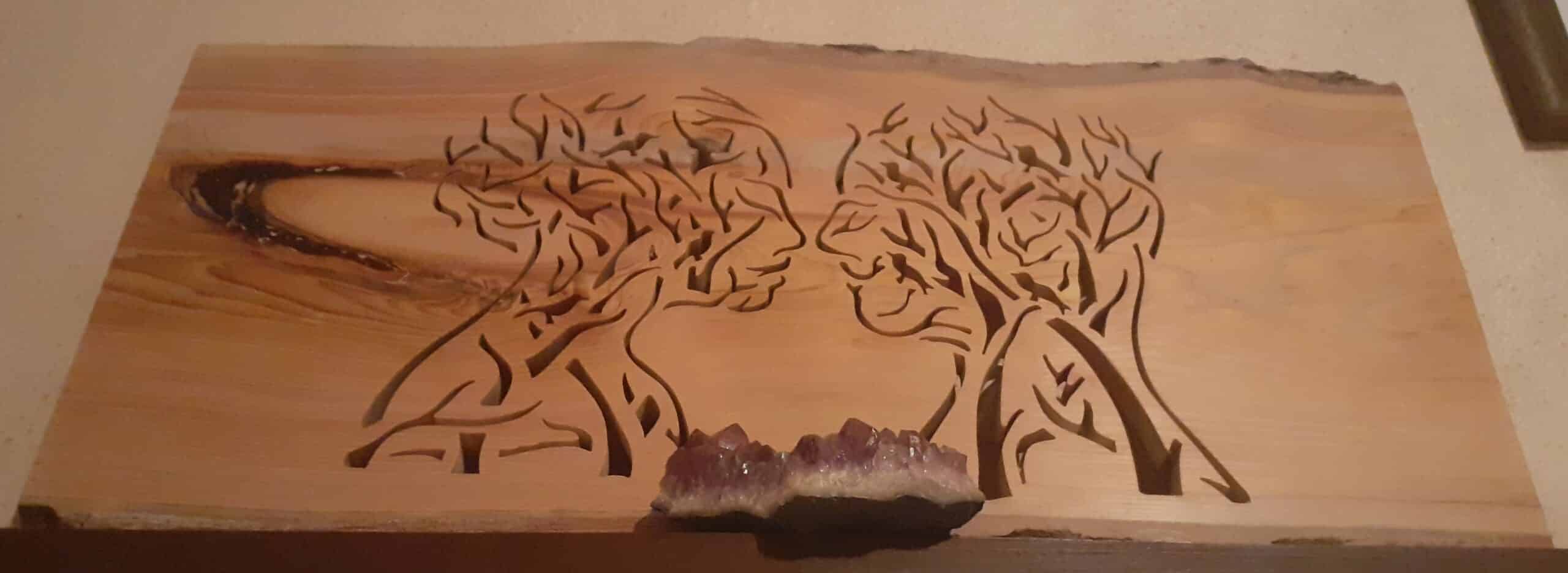 Tableau mural réalisé dans du bois de Cèdre ; travaillé selon la technique dite dentelle sur bois à l'aide d'une scie à chantourner électrique pour la phase découpe.