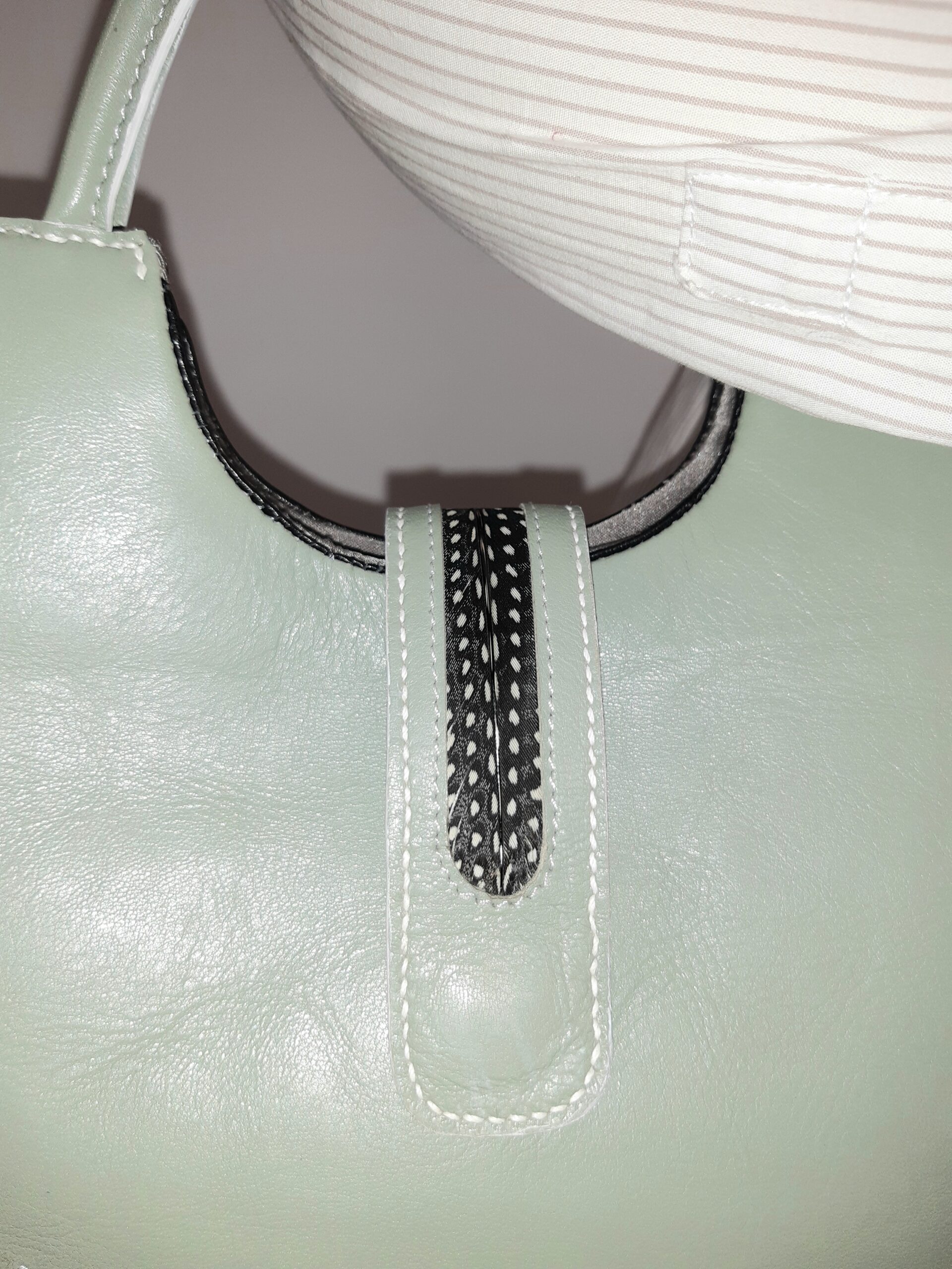 Inclusion de plumes de pintades dans la patte de fermoir ainsi que dans le bas de la face avant.